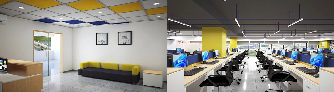Drawing inspiration from Royal Sundaram's branding, SDKP utilized the colors yellow and blue throughout the office. These colors, reflective of the Royal Sundaram logo, were seamlessly integrated into various elements such as the ceiling, flooring, workstations, and high barstools.